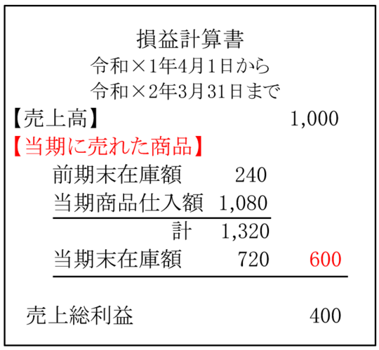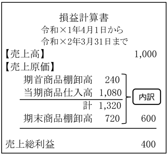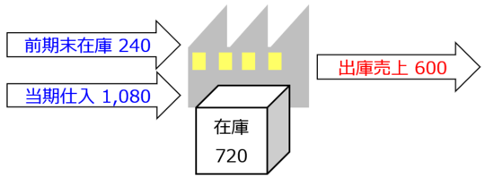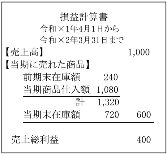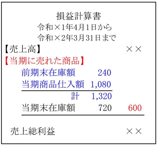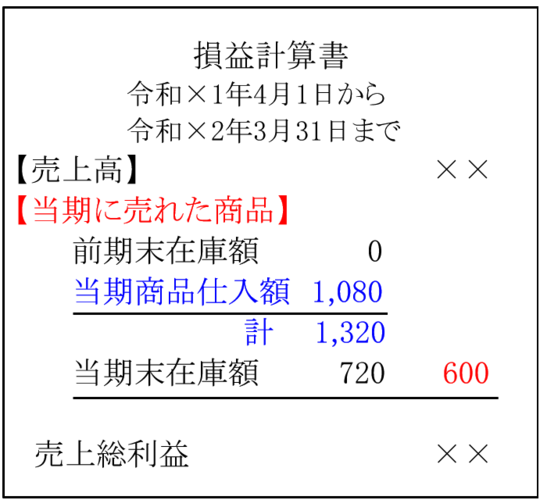 1,320-当期末在庫額720=当期に売れた商品(売上原価)600