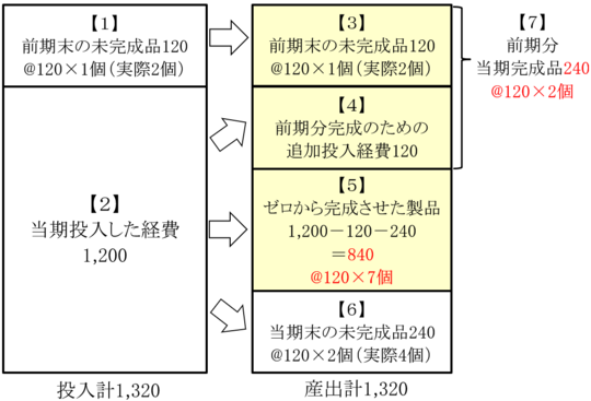 【1】前期末の未完成品120+【4】追加投入経費120=【7】前期分当期完成品240