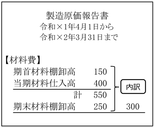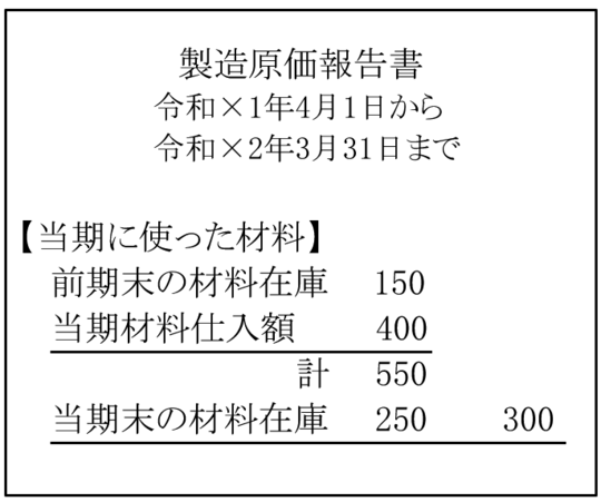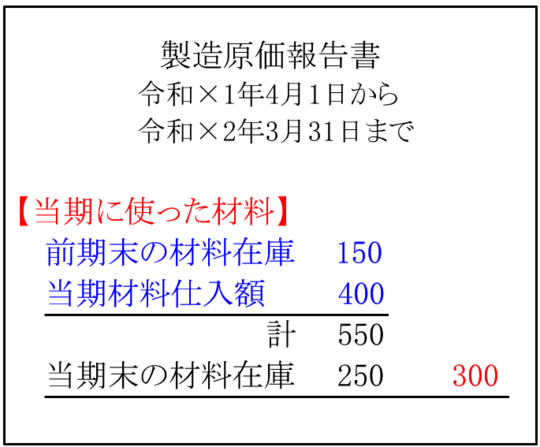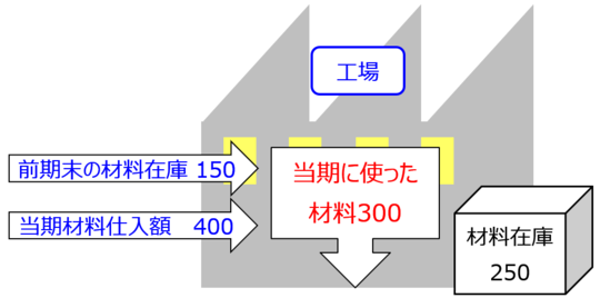 550-当期末在庫額250=当期に使った材料(材料費)300
