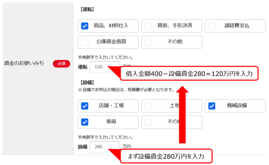 融資希望額や、借りたお金を何に、いくら使うのか、