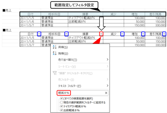 上図のとおり、「軽減8%」の文字でフィルタをかけると