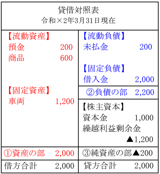 資本金1,000+繰越利益剰余金▲1,200=▲200です。