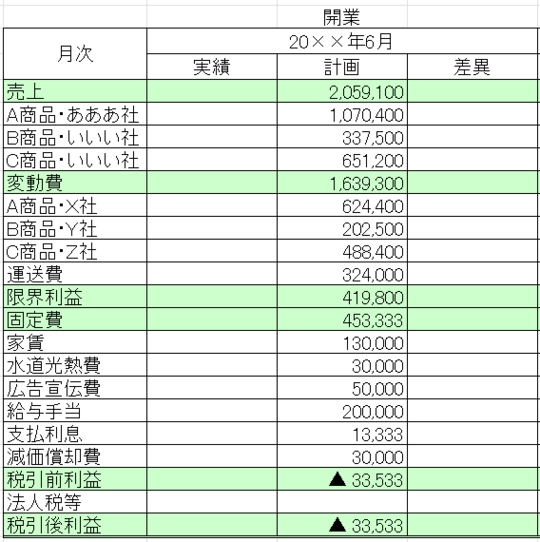 「計画」の金額は創業計画書の金額そのままです。