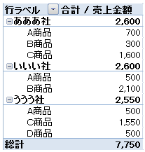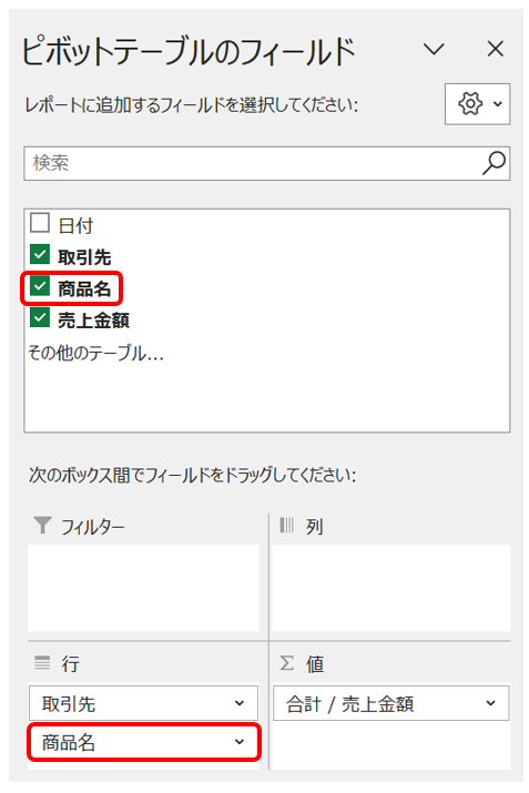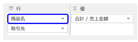 ピボットテーブルで、どうすれば取引先ごと、商品ごとの売上が分かりますか?