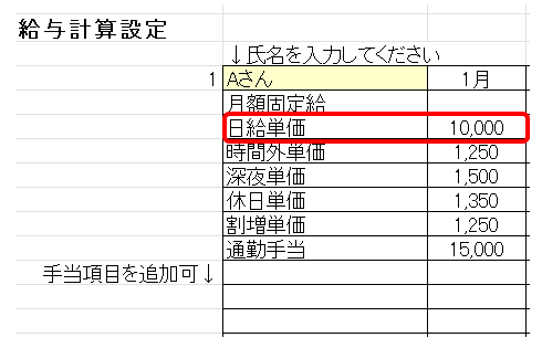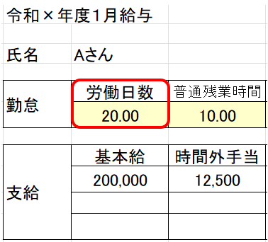 「支給」欄の「基本給」に日給×日数が計算されます。