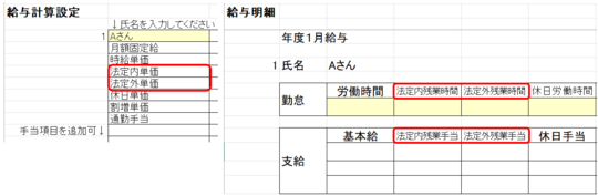 「給与明細」シートの各種残業時間と各種残業手当金額の項目名を変更します。