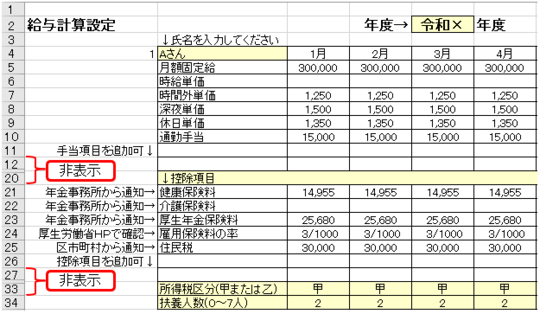 項目数が多くて「給与計算設定」シートが縦に長く、正直、使いづらいです。