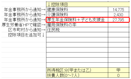 給与計算設定シートの「厚生年金保険料+子ども支援金」の欄に、