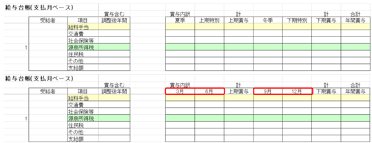赤い枠のように、賞与項目を支給月に変えることもできます。
