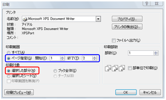 「ページ指定」で1枚目から開始して2枚目で終了するように設定します。