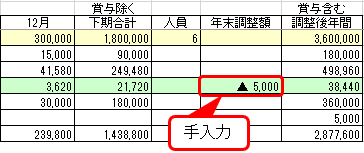 調整する所得税の金額を手入力します。緑色の箇所です。