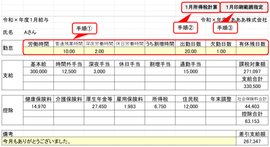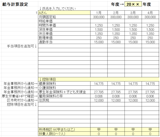 毎月の給与計算は、「給与明細」シートのみを使います。